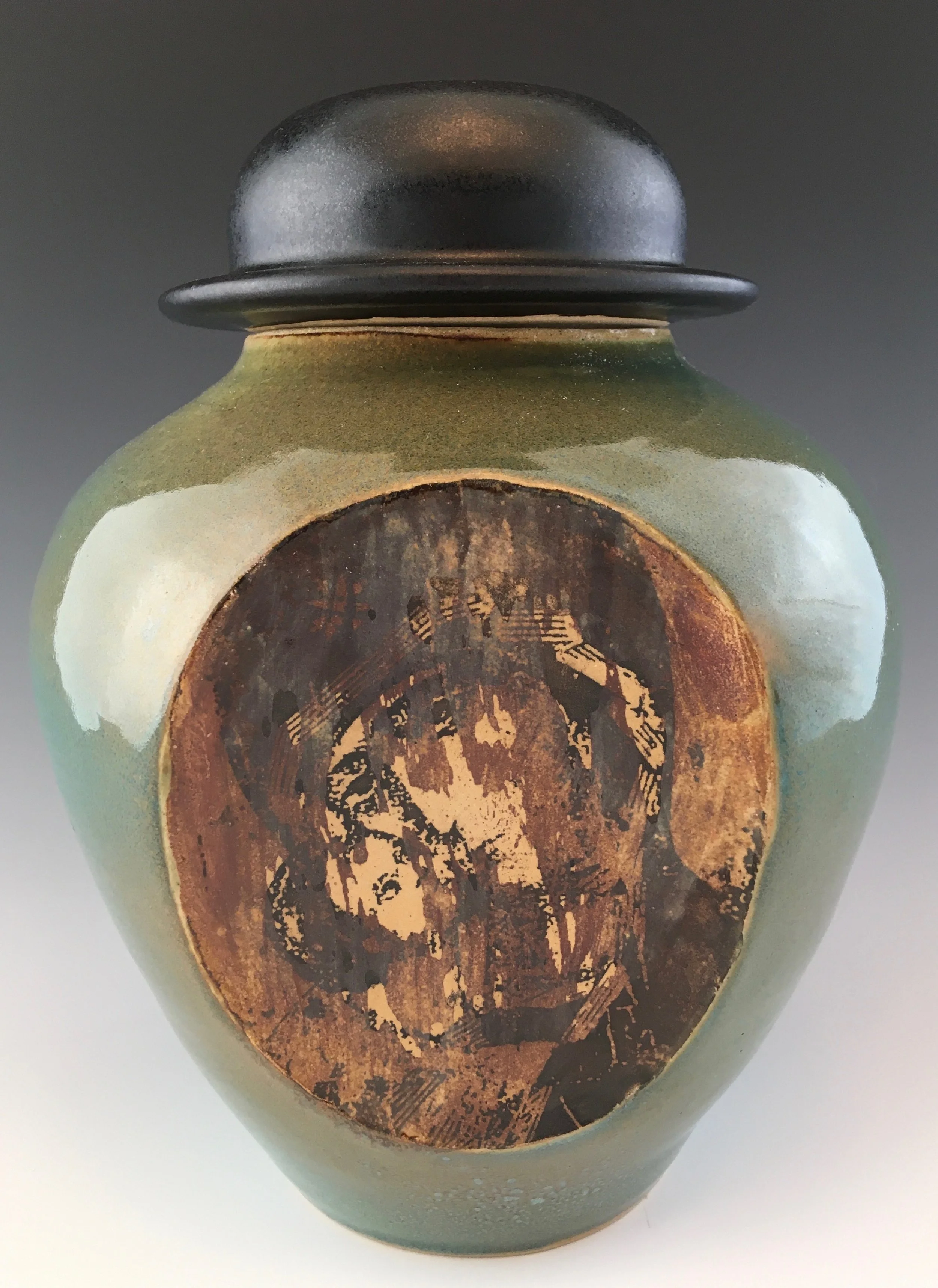 9 x 6 inches, stoneware, silkscreened pigment, glazes